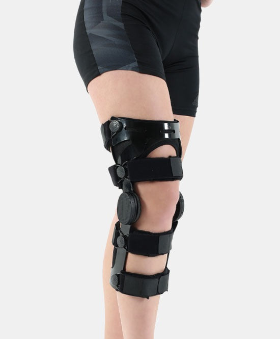 دعامة صلبة خفيفة من الألومنيوم بآلية حدّ للثني والمدّ (ثني: 0°/15°/30°/60°/90°/120° — مدّ: 0°/15°/30°) لتثبيت الركبة ومنع فرط البسط مع مبدأ الأربع نقاط للثبات.