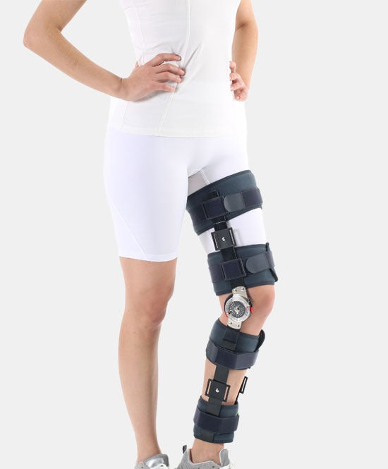 دعامة بدرجة زاوية متغيّرة مع أذرع ألومنيوم خفيفة وبطانة مريحة. تتيح ضبط الثني عند 0°–120° والمدّ من −15° حتى 90° لمواءمة بروتوكولات التأهيل.