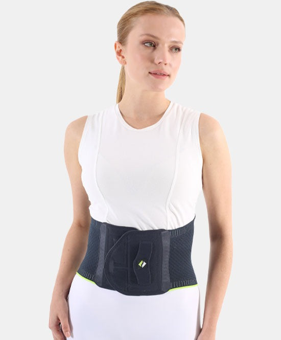 نسيج محاك ثلاثي الأبعاد مطابق لتشريح أسفل الظهر مع 4 دعامات معدنية خلفية يمكن تشكيلها يدويًا بما يتوافق مع تقوّس القطنية، لتخفيف الشدّ العضلي وتسكين الألم.