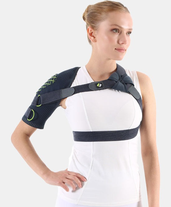 نسيج محاكٍ ثلاثي الأبعاد قابل للتنفس يوفّر ضغطًا علاجيًا يخفّف الوذمة ويقلّل التوتّر العضلي حول الكتف. أشرطة مرنة تعبر من خلف الكتف وتحت الإبط ثم تتلاقى أمامًا لتأمين تثبيت مريح وعالي الفعالية. يتوافر لليمين أو اليسار.