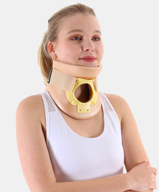 دعامة صلبة ثنائية القطعة مزوّدة بفتحة تراكيستومي لتسهيل العناية والتنفس. مصنوعة من رغوة بلاستازوت بسماكة 12 مم لتثبيت فعّال للعنق وتقليل حركات الانثناء والتمدد، مع تصميم تشريحي يمنح ثباتًا مريحًا ويخفّف الشدّ والتيبّس خلال فترات التعافي.