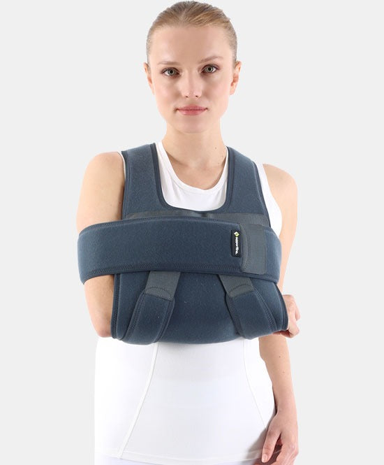ضماد تثبيت للكتف والذراع بسطح إسفنجي مريح، مصمَّم تشريحيًا ليدعم الذراع والكتف ويثبت الجزء العلوي من الذراع في وضع التبعيد. يلتف الحزام حول الصدر لزيادة الثبات، وتُسهِّل أشرطة الإغلاق الأمامية عملية الارتداء والخلع خلال المتابعة العلاجية.