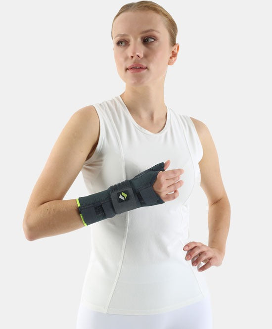 دعامة قابلة للتنفّس ومضادّة للحساسية، مصمّمة تشريحيًا لتثبيت المعصم والإبهام وتقليل الحركة غير المرغوبة. توفّر البنية المرِنة ضغطًا متدرّجًا يساعد على الحدّ من التورّم ودعم الأنسجة، فيما تعمل سنادة ألومنيوم على تثبيت المعصم والإبهام في وضعية مريحة للراحة والتعافي. يتكامل معها حزام محيطي حول المعصم لزيادة الثبات.
